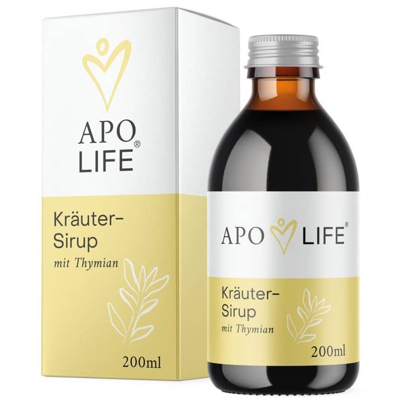 ApoLife Kräutersirup mit Thymian enthält 100% natürliche Tee-Kräuter in österreichischer Apothekenqualität. Er enthält reinen natürlichen Bio-Rohrzucker zur Konservierung und ist frei von künstlichen Zusatzstoffen. Mit Königskerze, Eibischblättern, Malvenblüten, Thymiankraut, Süßholzwurzel, Anis, Eibischwurzel.