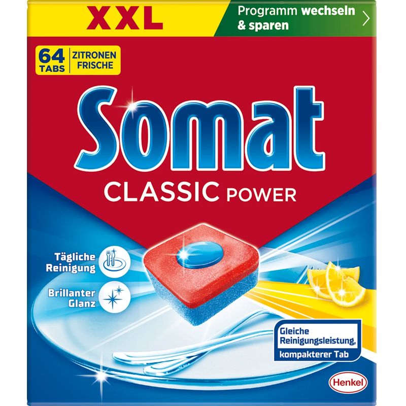 Hartnäckige Speisereste und Verschmutzungen werden dank der Somat Classic Tabs gründlich entfernt. Die Reinigungskraft der Spülmaschinentabs wirkt bereits bei niedrigen Temperaturen und sorgt für die optimale Pflege von Geschirr, Gläser, Töpfen und sämtlichen weiteren Kochutensilien. Zudem werden Tee- und Kaffeeflecken ohne große Mühen beseitigt. Schon ab einem Reinigungs-Tab pro Spülgang erstrahlt Ihr Geschirr in brillantem Glanz. Obendrein sorgt der integrierte Glasschutz für eine Langlebigkeit Ihres Geschirrs. Für ein einwandfreies Spülerlebnis.